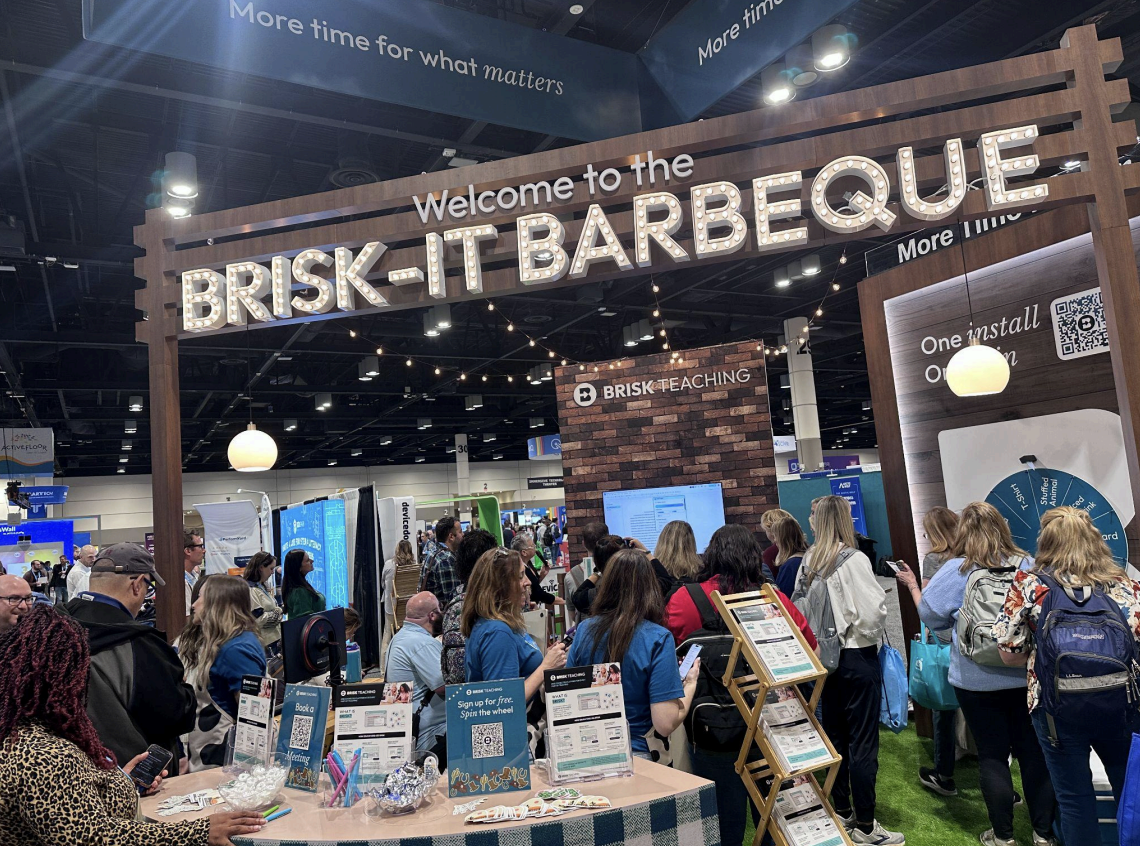 The Brisk-It Barbeque — Our flagship conference booth isn't a booth. It's a backyard. Fake grass, hay bale seating, picnic tables, string lights, marquee letter signage, a brick backdrop, and a photo wall built for sharing. At our last major conference, we ran a full programming schedule out of the space — named sessions, educator creator takeovers, live feature drops, and a Slam Poetry Night. Teachers didn't just stop by. They came back.